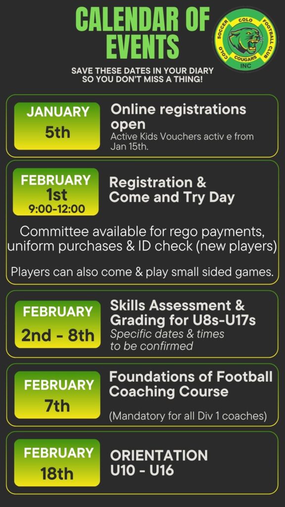 1. Unfortunately my son Greyson Cook won’t be at U/6 selection today – was previously with U/5 Sharks, However please let me know (Greg Cook – 0419285033) to which team he would be in, &/or who to contact that would be the manager & what day & time would training would be.